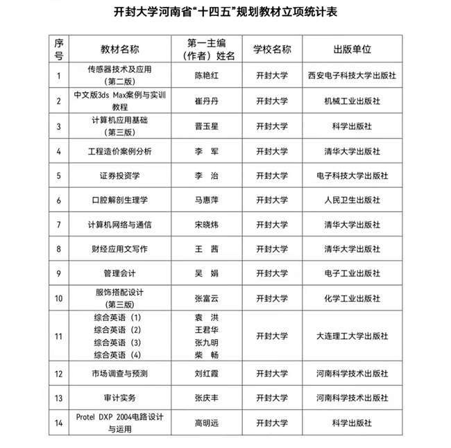近日,河南省教育厅公布了“十四五”普通188金宝搏beat官网登录 规划教材立项建设名单,开封大学14部教材获批河南省“十四五”普通188金宝搏beat官网登录 规划教材立项,其中4本教材获教育厅推荐申报国家“十四五”规划教材。