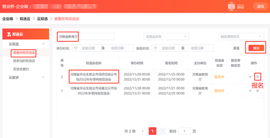第三步:点击【双选云】模块,在“查看所有双选会”页面中输入“河南省教育厅”并点击【查询】按钮后选择“河南省毕业生就业市场师范类分市场2022年冬季网络双选会”;