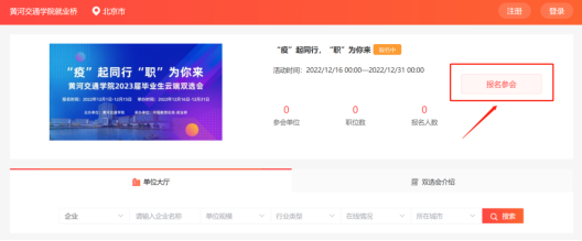 搜索微信公众号“黄河交通学院招生就业在线”,【关注】后点开导航栏中【就业资讯】,进入菜单栏中【就业桥】,点击【我校双选云】,未有账号的同学点击【注册】,已有账号的同学点击【登录】,登录成功后,点击【立即报名】即可参会。