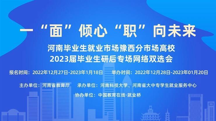 为全面贯彻落实金博宝最新官方网站查询网址 关于疫情防控工作的有关要求,更好地为用人单位提供安全、便捷、高效地信息沟通和双向选择平台,抓住当前毕业生求职的关键期、冲刺期,全力促进学校毕业生尽早就业。河南科技大学特联合金宝搏188入口 ·就业桥于2022年12月28日-2023年01月20日举办一“面”倾心 “职”向未来——河南毕业生就业市场豫西分市场高校2023届毕业生研后专场网络双选会,诚邀各用人单位和毕业生报名参会,现将有关事项通知如下: