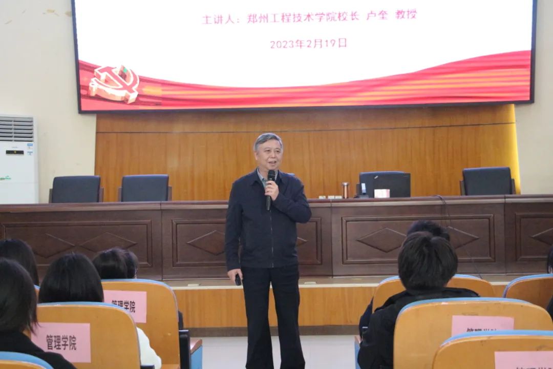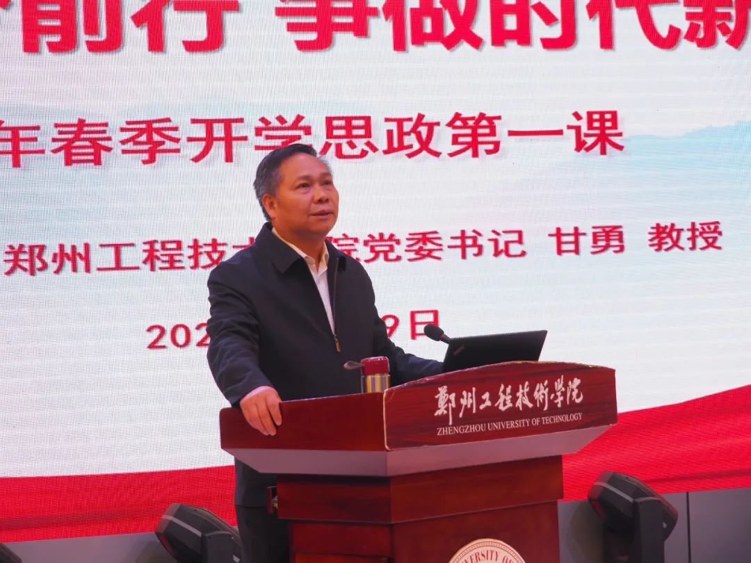 2月19日下午,郑州工程技术学院党委书记甘勇、校长卢奎分别在金河校区特教楼一楼演播厅、英才校区明德楼学术报告厅带头走上讲台为学生讲授春季开学思政第一课。校党委委员孙振营、常锋、吕村与500余名学生共同聆听了思政第一课。