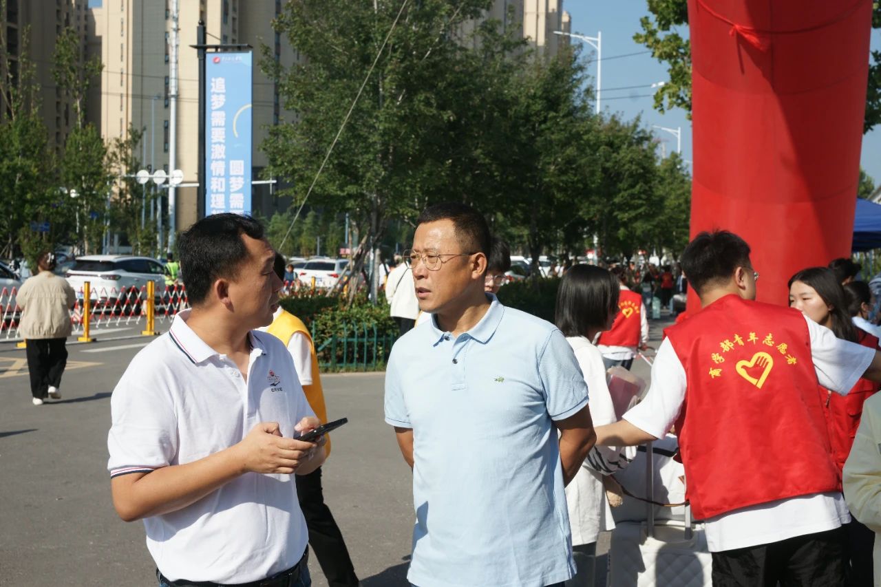 “早上几点到的呀?”“这几天你们辛苦了,记得多喝水呀。”胡大白董事长在南大门亲切的慰问学生志愿者并与志愿者合影。听到董事长关怀的话语,已参加迎新工作2年的2021级工学部学生志愿者李瑞杰心情激动。她表示会用最细心周到的服务使新同学在这里感受到家的温暖,用实际行动展现黄河科技学院青年学子乐于奉献的良好精神风貌。