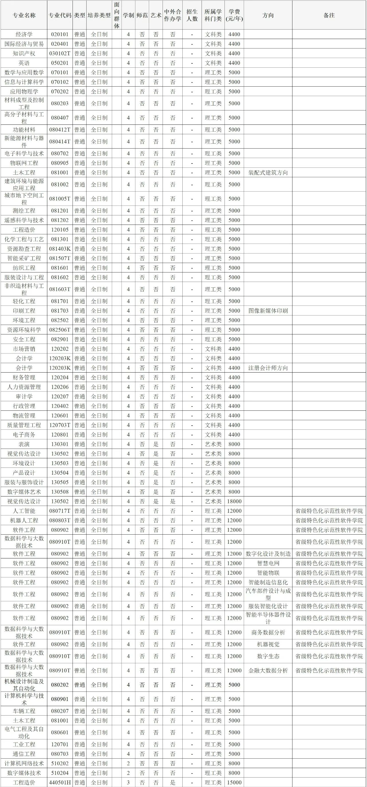 本科专业:艺术类8000元/年·生,理工类5000元/年·生,文史类4400元/年·生;其他专业:省级示范性软件学院本科专业12000元/年·生,专科专业8000元/年·生;中外合作办学专业:艺术本科专业学费18000元/年·生,普通专科专业学费15000元/年·生。