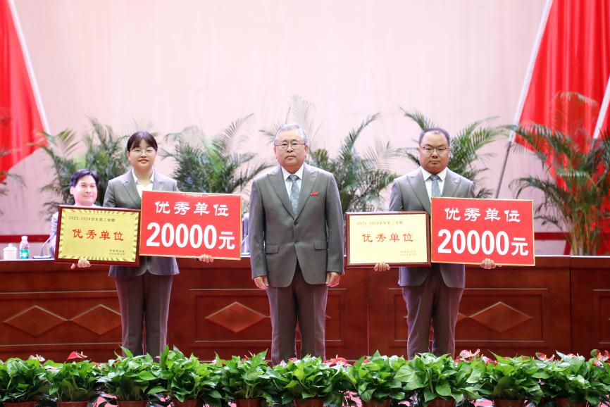 会上宣读了《关于表彰2023-2024学年第二学期优秀单位和优秀教职员工的决定》,与会校领导分别为优秀单位和优秀教职员工颁奖。