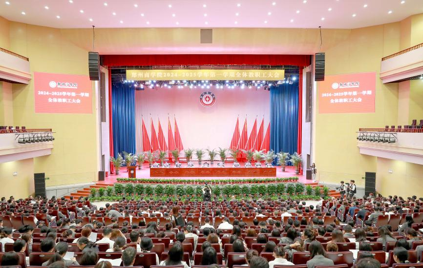 为全面总结上学期工作成效与经验,部署新学年工作目标与重点任务,推动各项工作高效有序开展,近日,郑州商学院在成功大会堂召开2024-2025学年第一学期全体教职工大会。董事长王育华、执行董事陈坚德、党委书记吴建军、校长吴泽强、董事长助理陈宗纬、党委副书记兼纪委书记裴晓涛、副校长兼工会主席张江涛、副校长刘升阳、校长助理泥川出席会议。全体教职员工参加会议。会议由校办主任张鹏主持。