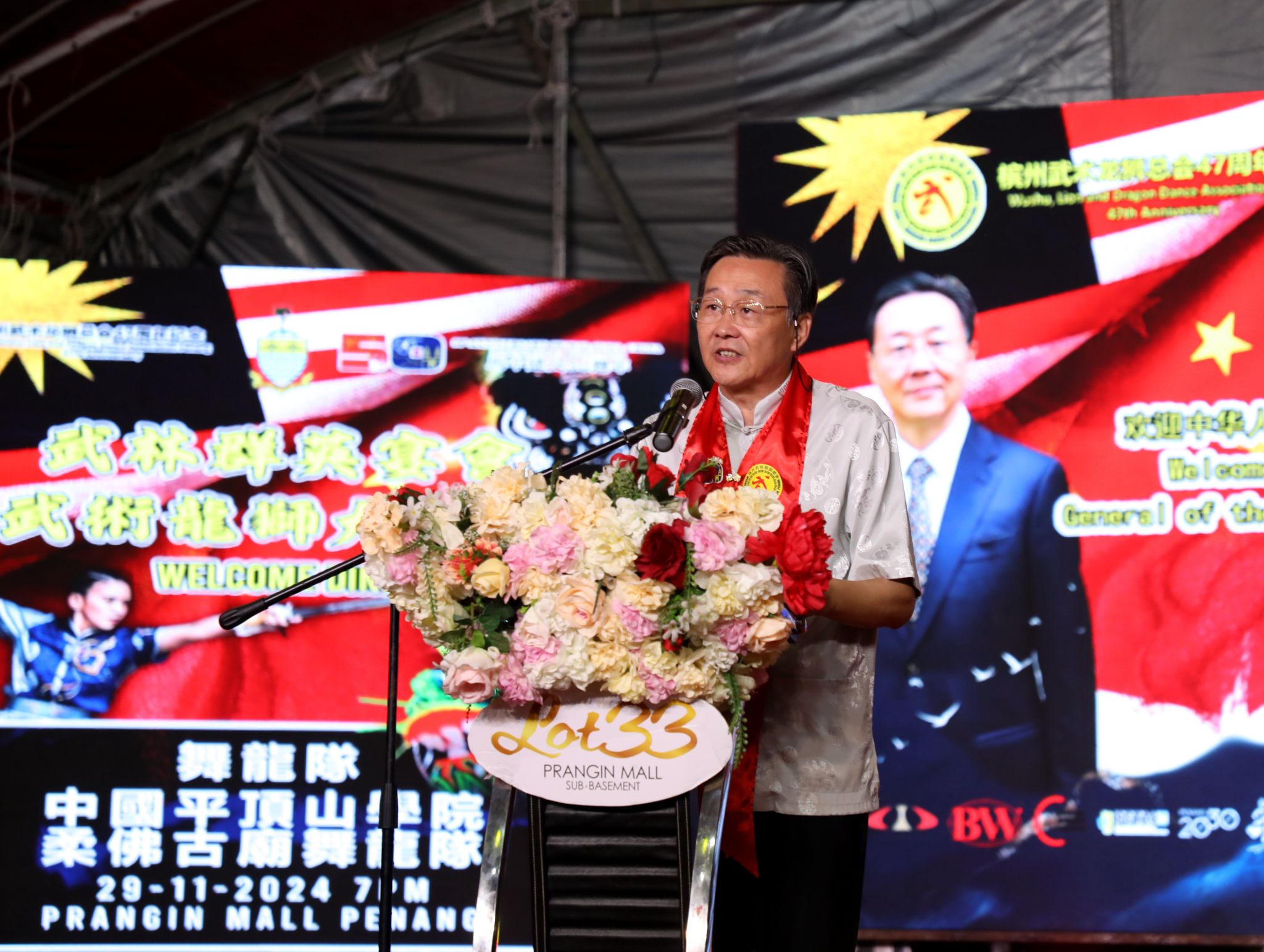 槟城国际龙狮武术节于11月29日晚盛大开幕,有来自马来西亚本地、中国、新加坡、泰国、印尼、澳大利亚、南非,中国香港、澳门等国家和地区的多支武术龙狮代表队,共千余人参加开幕仪式。中国驻槟城总领事周游斌、马来西亚槟州首席部长曹观友、马来西亚财政部副部长林慧英、国际武术联合会副主席吴延贵、中国龙狮运动协会副秘书长王璐璐及槟城市政和民间组织主要负责人等出席活动并致辞。开幕式由槟州武术龙狮总会会长拿督方万春主持。