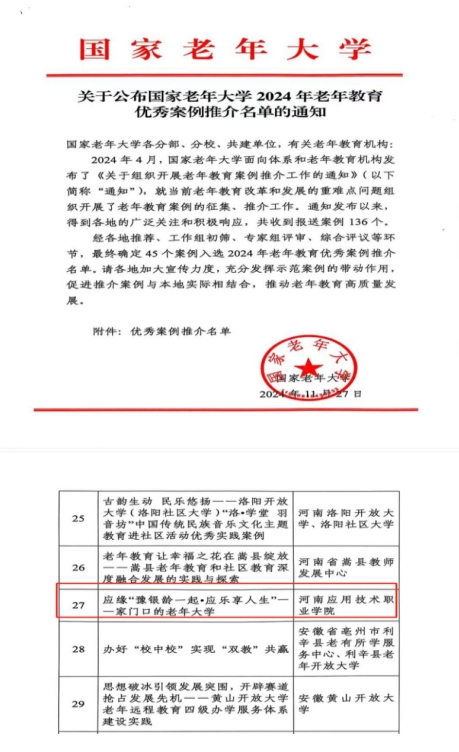 近日,国家老年大学下发《关于公布国家老年大学2024年老年教育优秀案例推介名单的通知》,河南应用技术职业学院申报的应缘“豫银龄一起·应乐享人生”——家门口的老年大学入选国家老年大学2024年优秀案例推介。