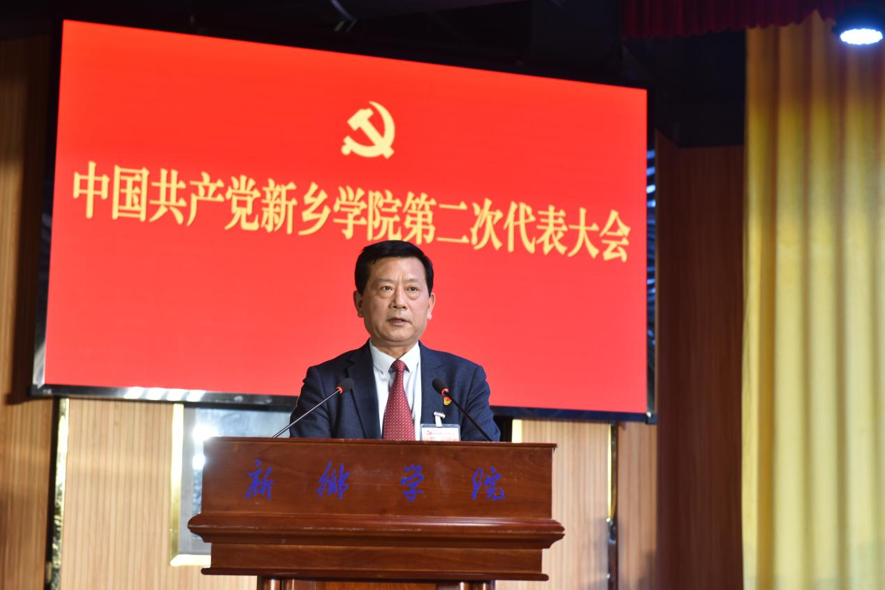新乡学院党委书记孙功奇代表中国共产党新乡学院第一届委员会作题为《高举伟大旗帜 勇担时代使命 为加快建设高水平应用型大学而努力奋斗》的报告。报告全面总结了第一次党代会以来的工作成绩和宝贵经验,科学分析了学校事业发展面临的机遇与挑战,明确了未来十年学校建设发展的总体安排,部署了今后五年学校的重点工作。