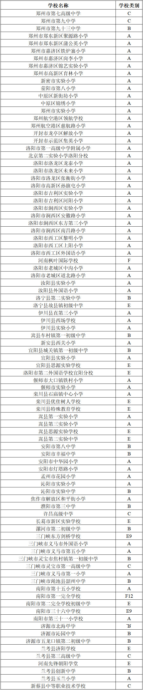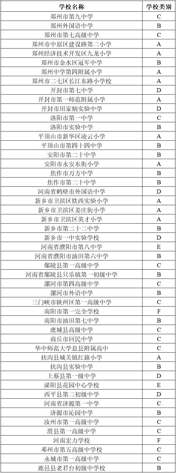 备注(学校类别):A小学,B初中,C高中,D完全中学,E9九年一贯制学校,F12十二年一贯制学校。