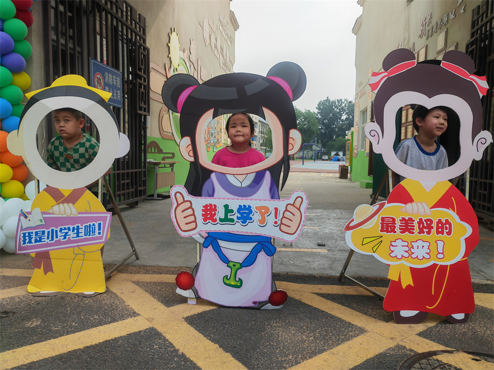 8月21日一大早,在郑州市京广路小学门口首先映入眼帘的是学校精心设计的几个可爱的卡通书童展板、彩虹气球门,生机勃勃的景象吸引了众多孩子前来打卡留念,从幼儿园过渡到小学,这些孩子们对即将到来的小学生活充满了期待。
