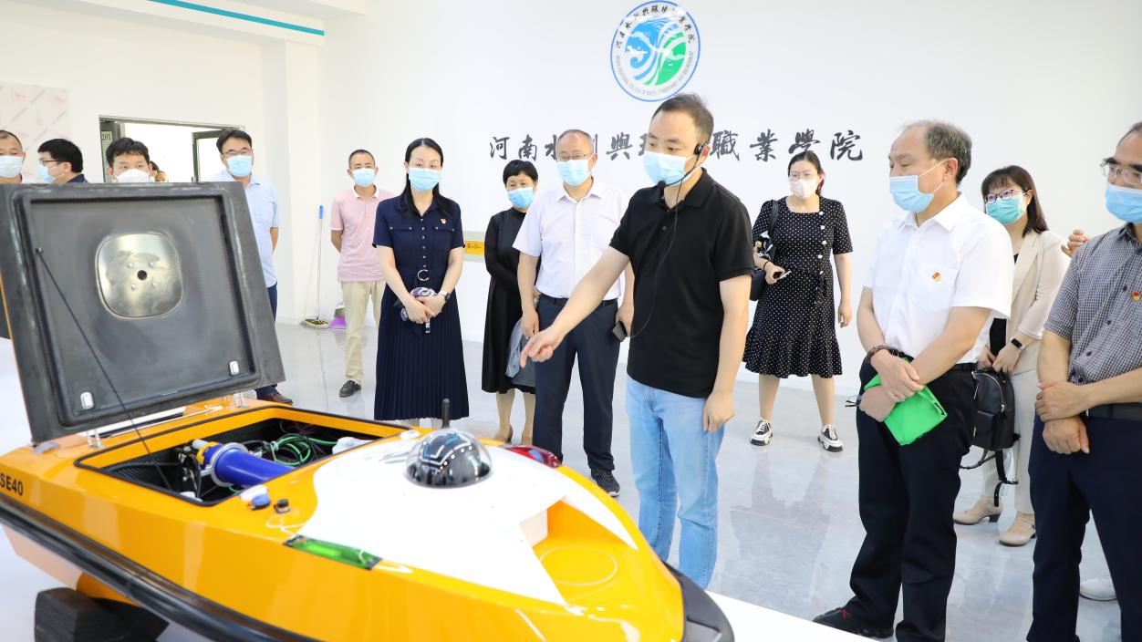 6月14日上午,河南省水利厅到河南水利与环境职业学院航空港校区开展2022年全国科技活动周活动,实地察看了学校新校区建设,观摩了专业实训教学中水利科技应用情况。省水利厅科技与对外合作处处长王彦哲、一级调研员陈丽、副处长郑光大,信息中心主任张明贵,移民安置处副处长胡广超等机关处室干部职工20余人参加活动。