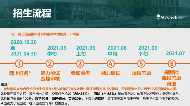 目前南科大综合评价报名正在火热进行,4月30日截止,报名与任何其他高校招生、志愿填报均不冲突,感兴趣的理科考生和家长可以登录南科大本科招生报名系统:https://register.sustech.edu.cn,注册仅需两分钟。校方提醒,学校能力测试湖北省考点设在武汉,考试范围是高中所学知识,重点考查考生运用知识分析、解决问题的能力,创新能力和综合素质。时间安排在高考之后,6月中旬举行。