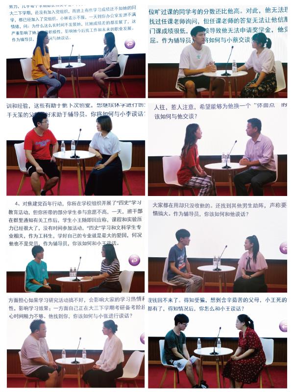 武汉城市学院第三届辅导员素质能力大赛于5月上旬全面启动,经过初赛比拼,有22名辅导员进入复赛,该校机电工程学部辅导员王祖法等8名辅导员参加素质能力大赛决赛。决赛包括谈心谈话和理论宣讲两个环节,主要考察辅导员对相关知识的掌握程度以及对信息的理解分析和解决问题能力。其中,谈心谈话环节,参赛选手围绕“大学生休学问题”“学校组织开展‘四史’学习教育活动”“学生被诈骗后续处理方法”等问题与学生进行谈话;理论宣讲环节,参赛选手围绕“坚定文化自信”“‘国家的发展、青年的责任’”“开展四史学习教育”等主题展开宣讲。