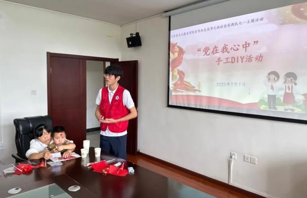 首先,开展了“党在我心中”手工DIY 活动。实践队员们每人带领一个小朋友,在家长们的协助下教小朋友们做手工DIY作品。