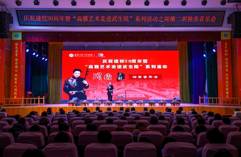 11月26日晚,庆祝武汉生物工程学院建校30周年暨“高雅艺术走进武生院”系列活动之周维二胡独奏音乐会在大礼堂举行。中国著名二胡演奏家周维以天籁琴韵弦动校园,现场1500多个座位,座无虚席。