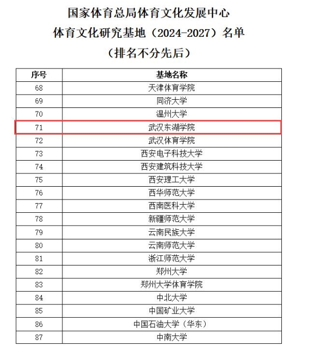近日,国家体育总局公布了总局体育文化发展中心体育文化研究基地(2024-2027)入选的89家单位名单,武汉东湖学院经自主申报、组织推荐、资格审查、现场答辩、专家评审、社会公示,最终成功入选。这是该校在体育学科领域获得的重要荣誉。