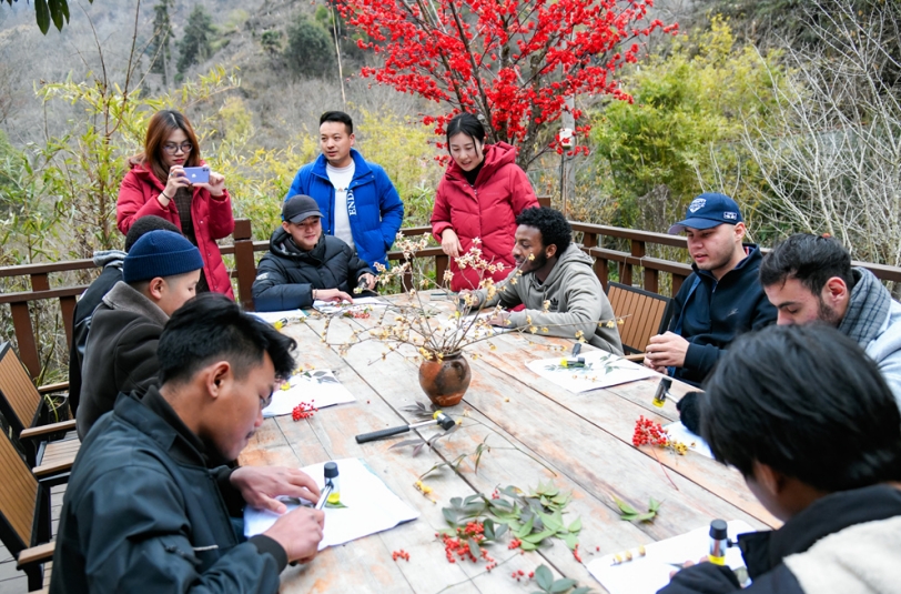 6日上午,研学团抵达首站太和梅花谷。正值寒冬时节,漫山遍野的腊梅含苞待放,山谷里暗香浮动,古朴别致的村落掩映在梅林里。外籍师生们被眼前的美景所吸引,穿梭于梅林间,畅游于山谷中,聆听导游讲述梅花谷的历史故事和竹山的风土人情。
