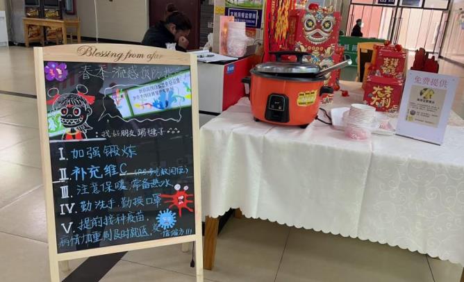 午餐时分,楚园食堂一楼的服务台前升起腾腾热气。在精心布置的新春装饰旁,整齐摆放着保温桶与小碗,并贴心标注着食材功效:“甘蔗生津润燥,马蹄清热润肺”。来往师生纷纷驻足,乘上一碗畅饮。“本来有点鼻塞,喝完整个人都通透了!”王同学捧着热气腾腾的糖水笑道。更有老师特意带着保温杯来装,“最近喉咙不舒服,下午工作时喝上一杯刚好润喉。”