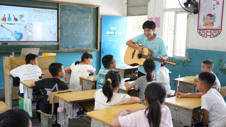 吉他声再次响起,孩子们摇晃着身体,小手时不时打着节拍,奶声奶气的嗓音里裹着认真,和志愿者一起唱着“粉笔在黑板跳舞曲,ABC排队做游戏,窗外的麻雀偷瞄我笔记……”。歌声里,藏着纯真的童心与闪亮的星光。(通讯员:田松 叶枫)