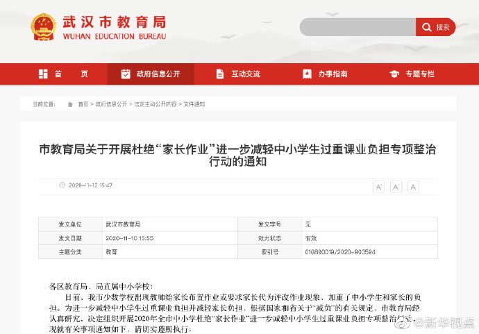 11月12日,武汉市教育局发出《关于开展杜绝“家长作业”进一步减轻中小学生过重课业负担专项整治行动的通知》,主要减负政策和规定包括: