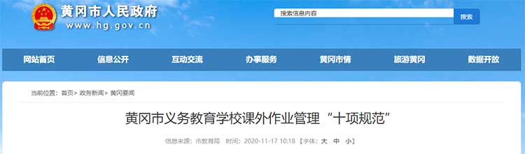 11月17日,黄冈市人民政府网发布《黄冈市义务教育学校课外作业管理“十项规范”》(以下简称“十项规范”),其中第二项规范明确提出,教师不得将学生的课业任务布置给家长完成,不得让家长或学生代为批改作业。该文件同时对书面作业总量、作业内容也做出了规范。