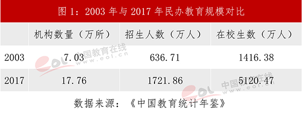 2003年,《中华人民共和国民办教育促进法》颁布实施,其后我国民办教育迅速发展。如图1所示,至2017年,民办教育机构数量达到17.76万所,招生人数达到1721.86万人,在校生人数达到了5120.47万人,较2003年均增长了数倍。