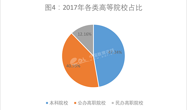 根据图4的数据可以看出,2017年民办高职院校占普通高校的比例同样明显低于本科院校和公办高职院校。