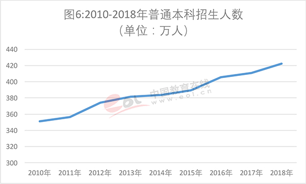 据数据显示,普通本科招生人数在2018年达到了422.16万人。2018年高考报名人数较2010年增长了3.07%,而普通本科招生人数则增长了20.19%。