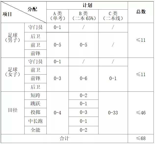 (注:田径项目:1.合格人数公示按金博宝最新官方网站查询网址 规定执行;2.根据实际生源及测试成绩情况可调整各项目招生人数,坚持择优录取,宁缺勿滥。足球项目:具体位置计划数按金博宝最新官方网站查询网址 相关规定另行公布)