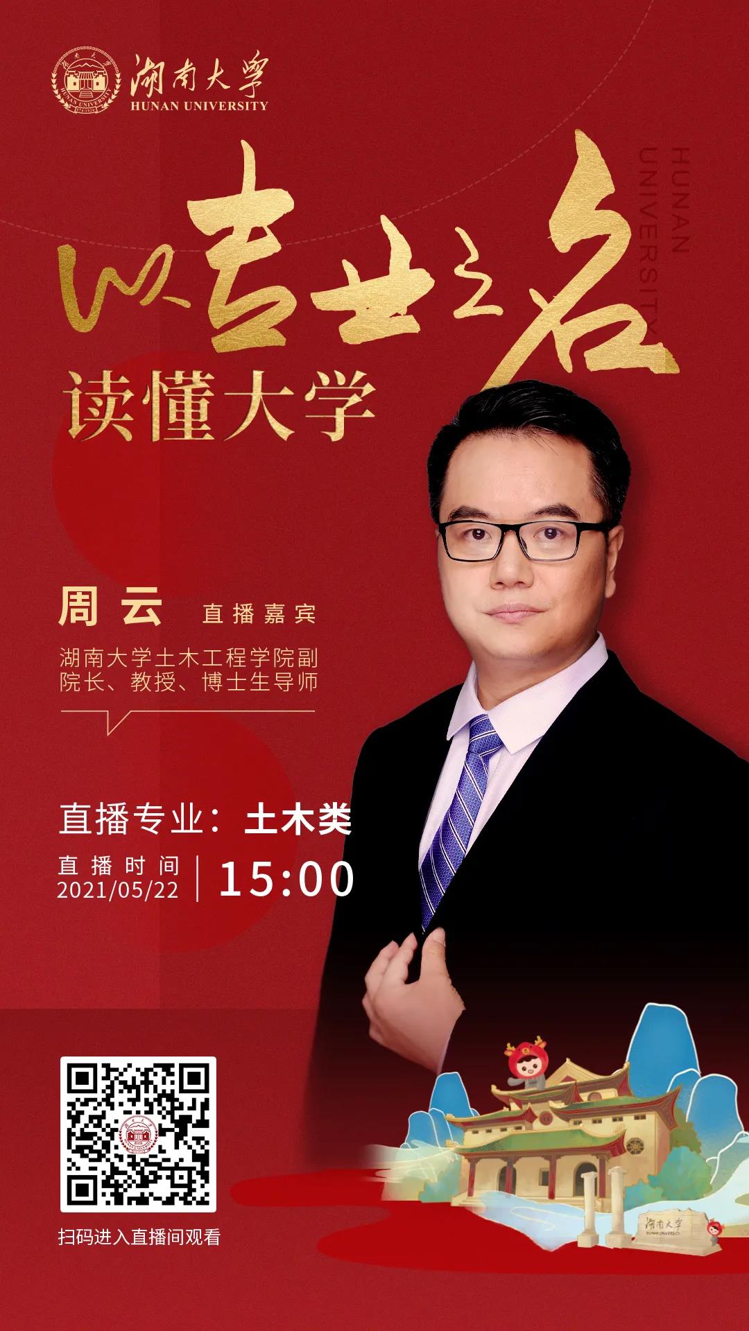 5月22日下午三点,土木类专业直播与你不见不散,湖南大学土木工程学院副院长,教授,博士生导师周云带你走进土木类专业,为你答疑解惑!