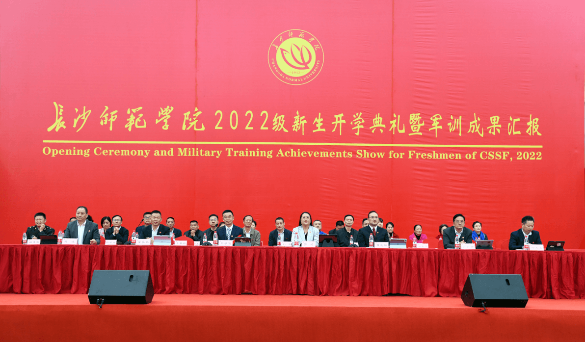10月7日上午,长沙师范学院南校区田径场红旗招展,人声鼎沸,3400余名新生齐聚绿茵场,举行2022级新生开学典礼暨军训会操。长沙师范学院全体校领导,各职能部门、各二级学院党政负责人,新生班辅导员等出席典礼。典礼由该校党委委员、副校长黄快林主持。