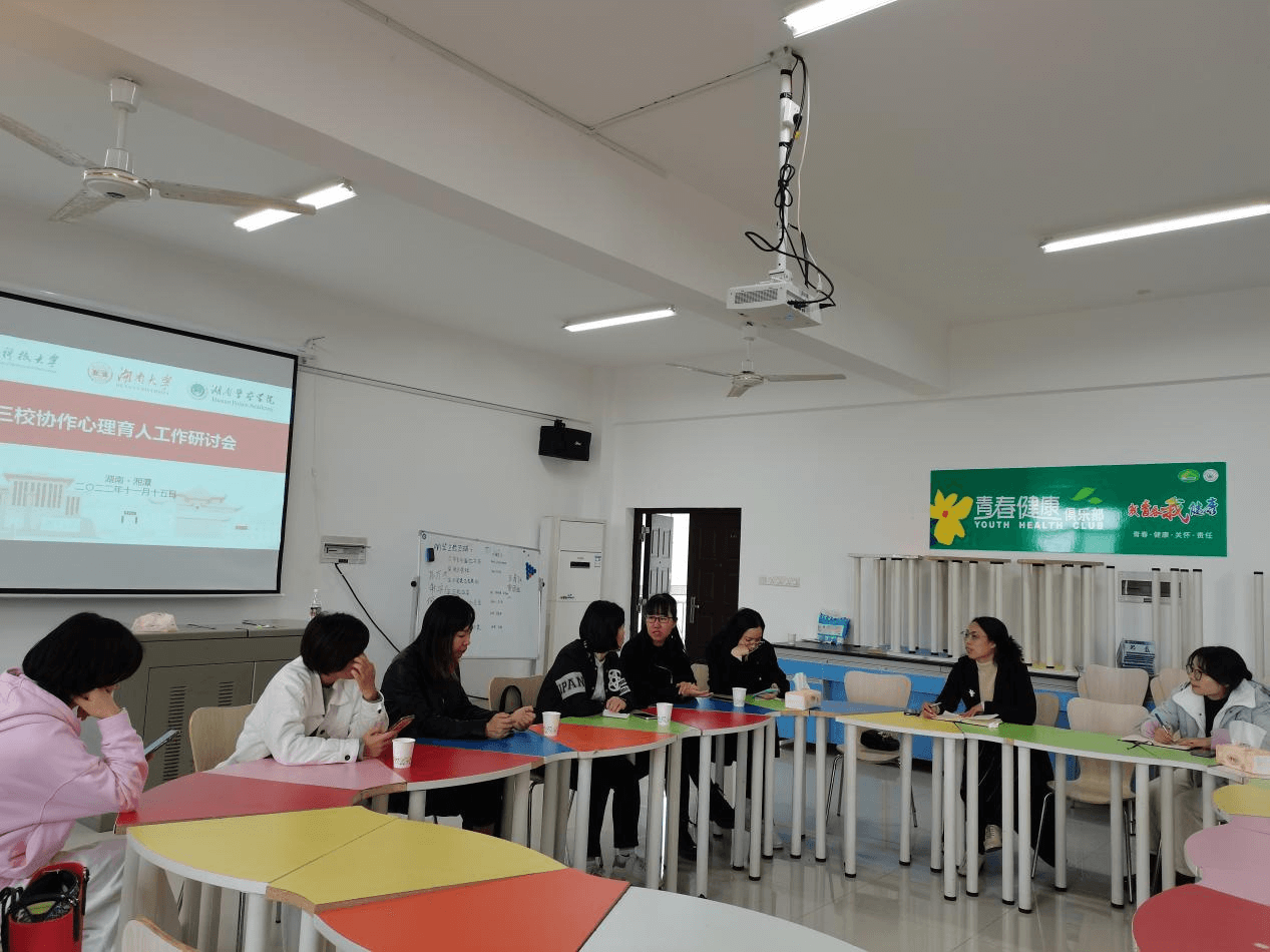 目前,三校协作开展的下半年2022级新生普查回访工作正在有序进行,湖南科技大学与湖南警察学院于11月13日前往湖南大学协助开展新生回访工作。三校就新生普查与回访现阶段工作进行了回顾和充分研讨,并对下一步三校协作相关工作的开展进行了充分谈论,在团体督导、课程建设、培训讲座等合作方面达成了一致意见。在交流中,三校老师均希望在课程建设的教学目标、教学难点、教学设计等方面进行深入交流,分享各个学校的教学理念和课程特色,商议下一步将在湖南警察学院开展为期一天的课程建设交流会。