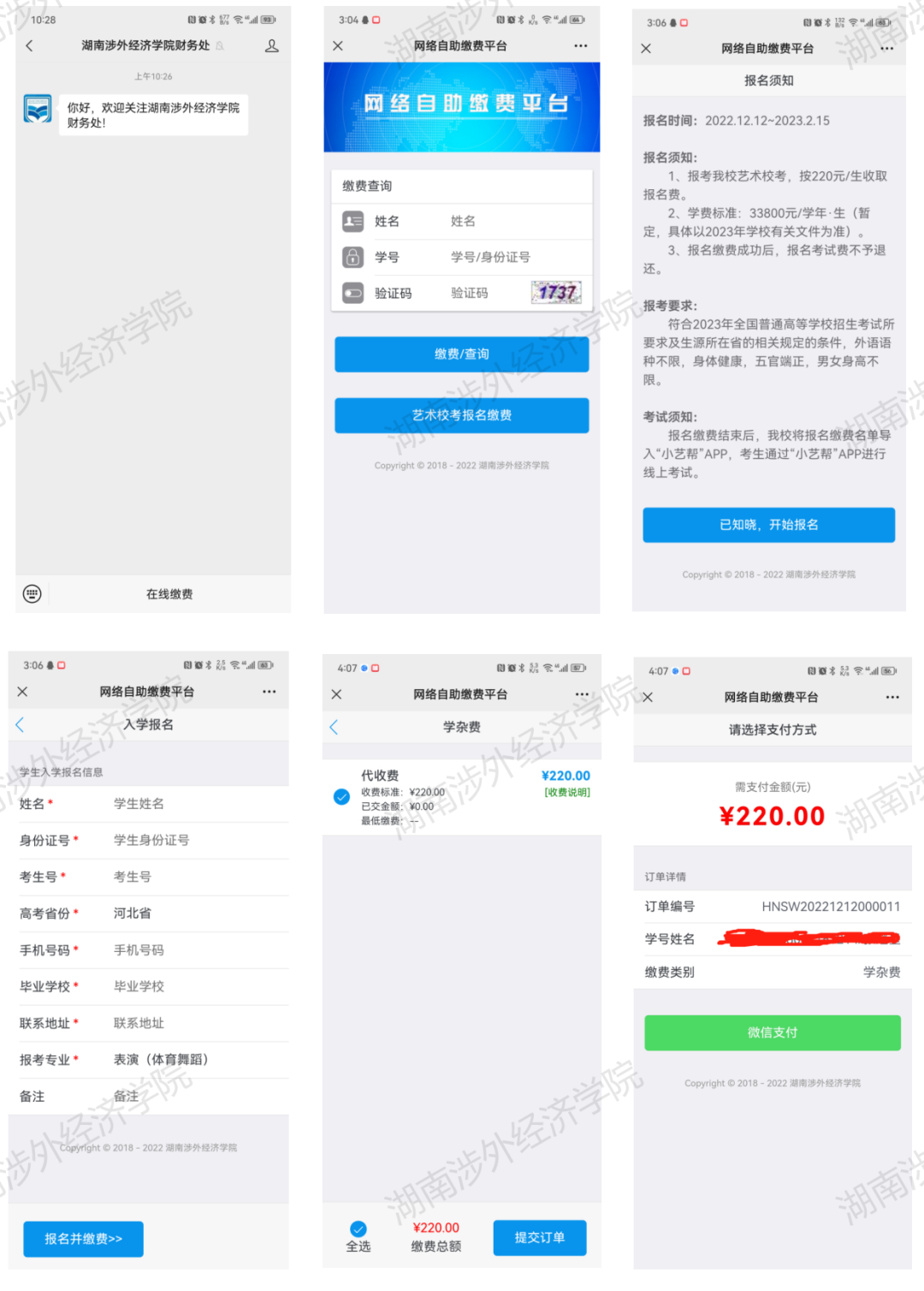 1、报名及缴费方式:手机查询微信公众号“湖南涉外经济学院财务处”进行报名、缴费。