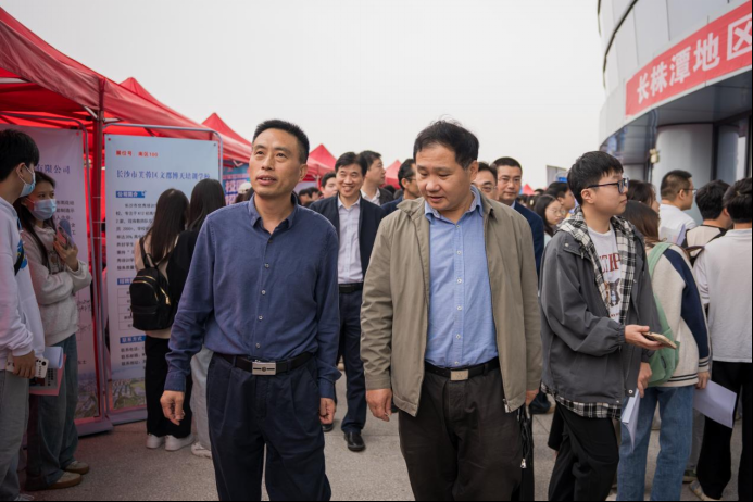 湖南省教育厅学生处副处长李希敏、湖南省就业指导中心事业发展部部长周麟、岳阳市人社局局长林治学、岳阳市就业服务中心负责人郭智峰来校指导,校领导张国云、谢贵辉、丁跃浇、汤福球前往招聘会现场,详细了解本校学生择业就业情况。