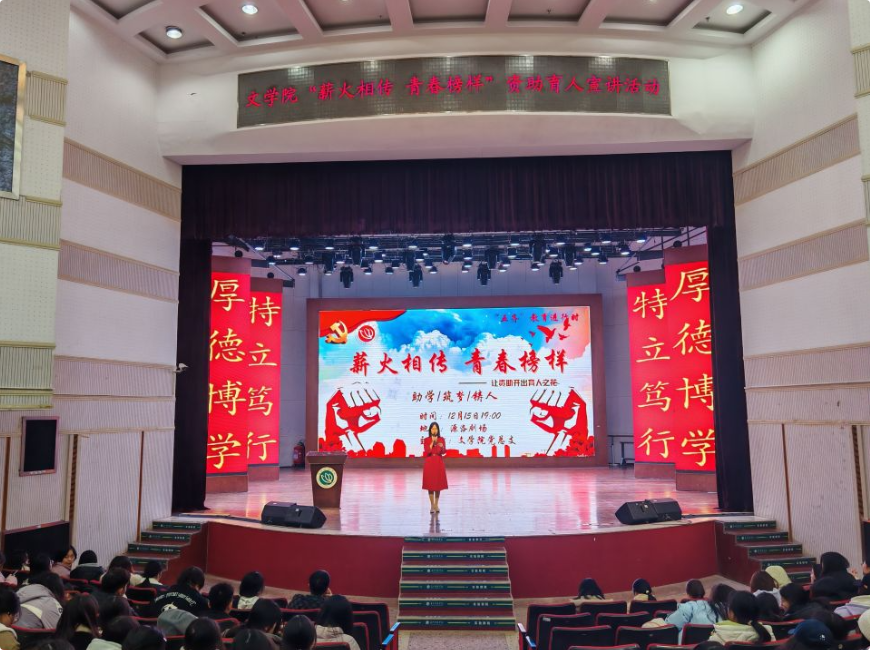 12月15日,长沙师范学院文学院在源洛剧场组织开展“青春榜样,薪火相传”励志宣讲活动,文学院汉语言专业400余人现场观看。