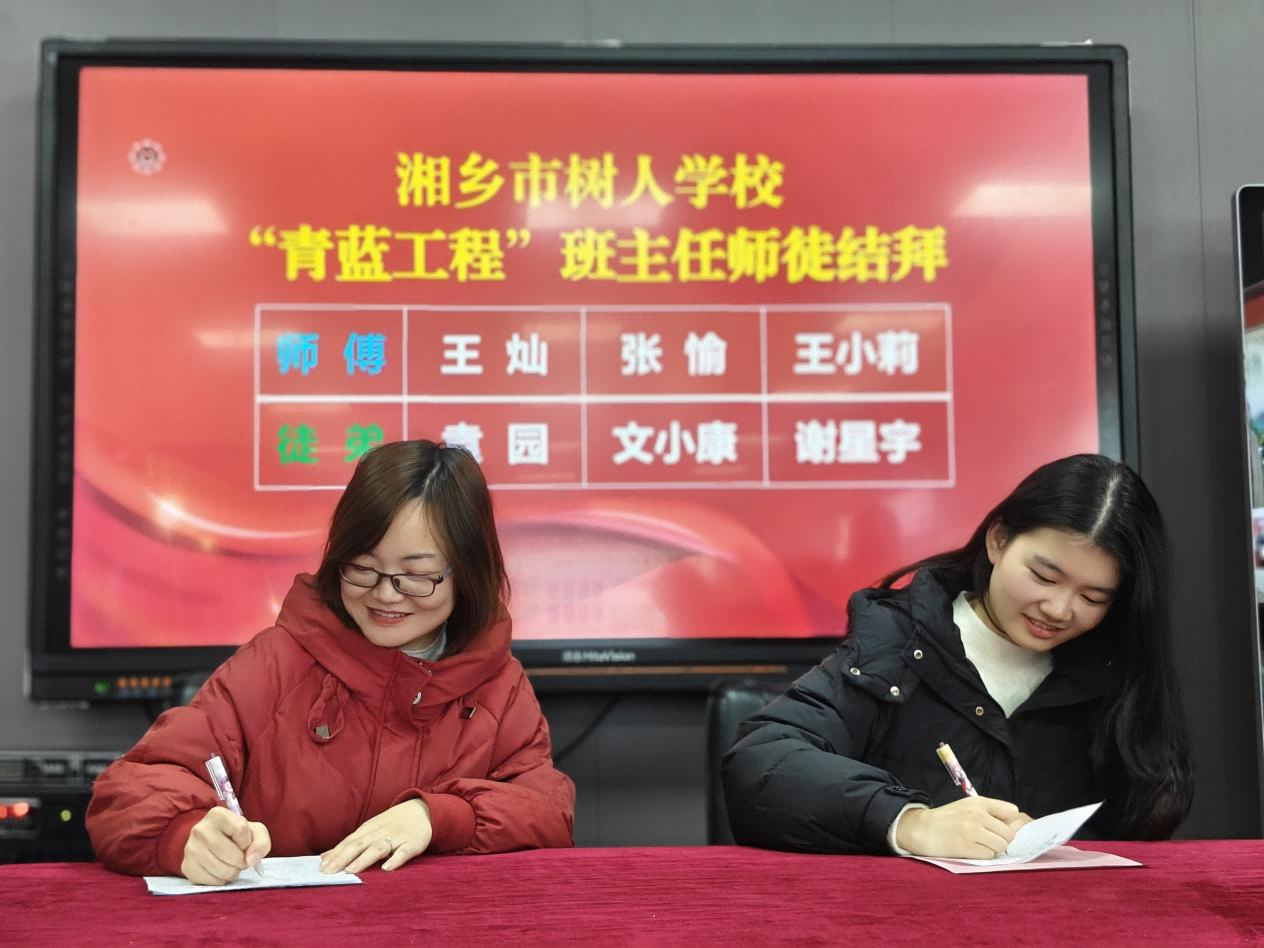 大会进行第二项:青蓝工程,师徒结对。班主任师徒携手在主席台举行师徒结对签字仪式,黄小天副校长为优秀班主任颁发青年导师聘书。校长助理谢根发作指导讲话,简要阐明了师徒结对的目的和意义,对师徒结对提出了明确要求,并祝愿师徒结对取得丰硕成果。