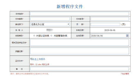 针对“程序文件”和“业务指导”两种类型的文件与“相关性支持性文件”以及“质量记录”的主辅关系,对含有“相关性支持性文件”、“质量记录”的内容的文件,系统根据文件编号以链接的方式关联到主文件。
