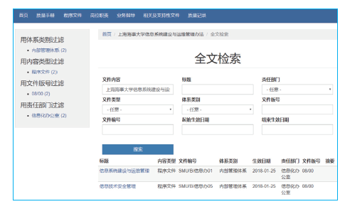 为使师生快捷有效的查询文件,用户可利用本系统“全站检索”功能。借助Apache Solr,实现对质量管理文件的责任部门、文件类型、文件编号、体系类别等信息进行检索;另外,采用Tika实现对文本内容的搜索。