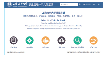 上海海事大学质量管理体系文 件繁多,总体分为质量手册、程序文件、相关及支持性文件、质量记录、岗位职责等类型,主要由全校各部门经审核流程提交后,由质量管理办公室进行管理,所有文件经授权发布,供校内师生查阅。
