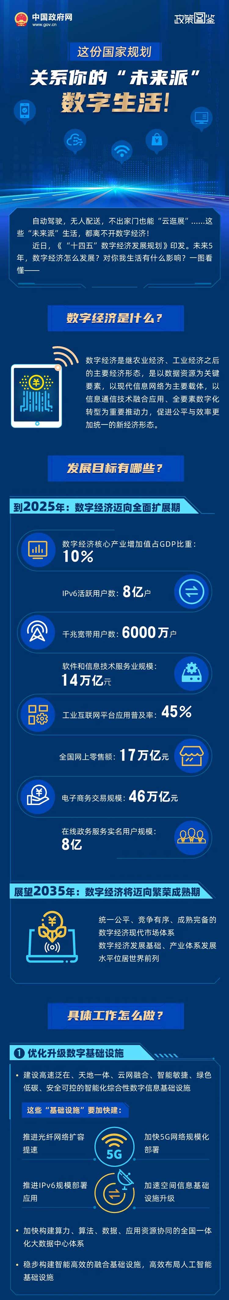 国务院日前印发《“十四五”数字经济发展规划》(文件全文及图鉴附后),明确了“十四五”时期推动数字经济健康发展的指导思想、基本原则、发展目标、重点任务和保障措施。《规划》提出:深入推进智慧教育,推进IPv6规模部署应用,增强网络安全防护能力,有序推进基础设施智能升级。