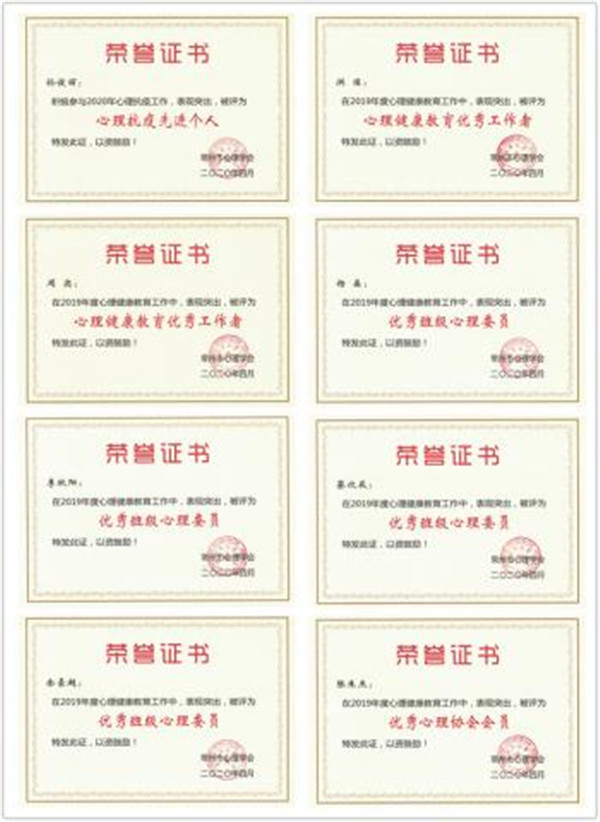 在2019年常州市心理学会先进集体和个人的评选中,常州工程职业技术学院荣获“先进集体”奖,孙俊丽老师获“心理抗疫先进个人”荣誉称号,洪煜、周奕老师获“心理健康教育优秀工作者”荣誉称号,余豪超、蔡炆辰、李秋阳、杨晶同学获“优秀班级心理委员”荣誉称号,张朱杰同学获“优秀心理协会会员”荣誉称号。