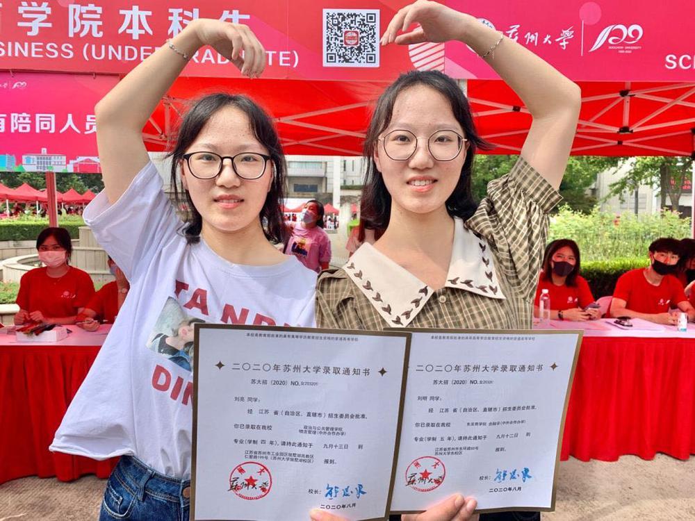 今年拿到第一封苏大录取通知书的“小20”马亦明,不仅生日与苏大校庆日同一天,母亲是苏州大学1996届毕业生。她在父母陪伴下前来报到,以“苏二代”的身份和苏大再次结缘。“对大学生活十分期待,要努力成为更好的自己。”提起即将开启的大学生活,她激动地说。