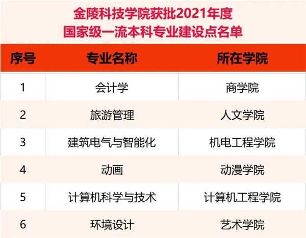 近日,根据《金博宝最新官方网站查询网址 办公厅关于公布2021年度国家级和省级一流本科专业建设点名单的通知》(教高厅函〔2022〕14号),金陵科技学院推荐的会计学、旅游管理、建筑电气与智能化、动画、计算机科学与技术、环境设计等6个专业获批国家级一流本科专业建设点。
