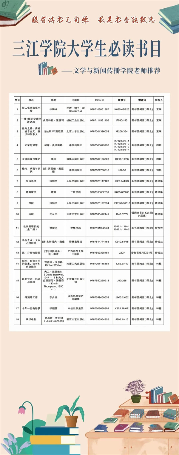在学生成才途径不断拓展的同时,知识焦虑与学习浮躁之气也与日俱增。针对同学们面对庞杂知识的茫然无措,面对海量信息的焦躁不安,三江图书馆推出“三江学院专业必读书目”征集活动。