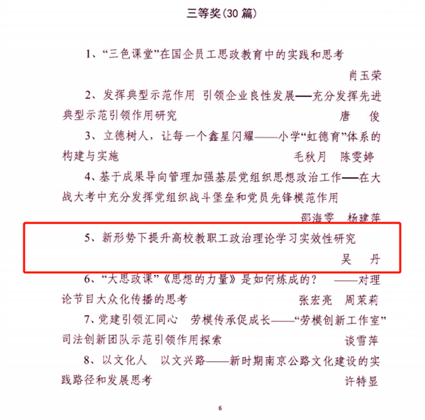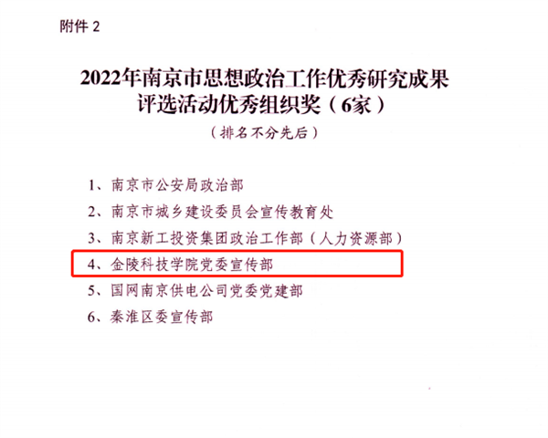 根据中共南京市委宣传部、南京市思想政治工作研究会《关于表扬2022年度南京市思想政治工作优秀研究成果的通知》,金陵科技学院报送的思想政治工作论文共有5篇获奖,其中一等奖1篇、三等奖1篇、优秀奖3篇,这是金科院连续第六年获奖,党委宣传部也荣获“优秀组织奖”。