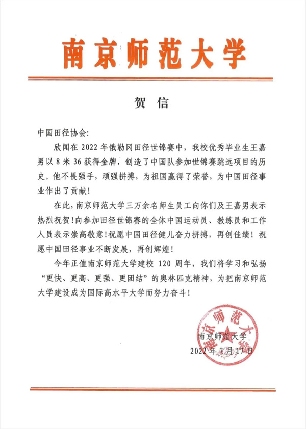 10南京师范大学向中国田径协会发去贺信 祝贺南师大毕业生王嘉男夺世锦赛男子跳远金牌