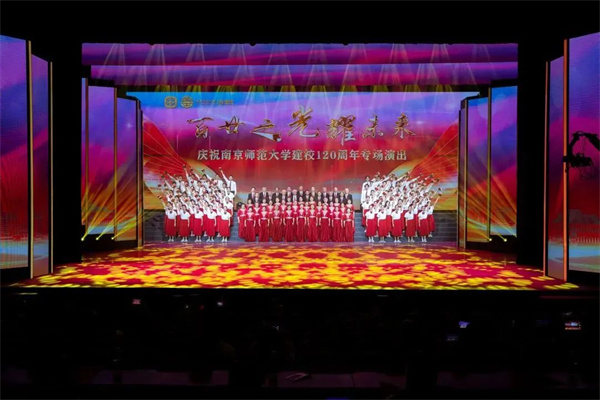 9月10日晚,庆祝南京师范大学建校120周年专场演出在仙林校区新北大礼堂隆重举行。全体校领导,校友代表,各学院、各部门负责人以及师生代表观看晚会。本场晚会同时采用网络直播的方式,全校师生员工、海内外校友和关心南师大发展的各界人士相会在校园、共聚在云端,头顶一轮明月,心中一片赤忱,共同庆祝南京师范大学百廿华诞。