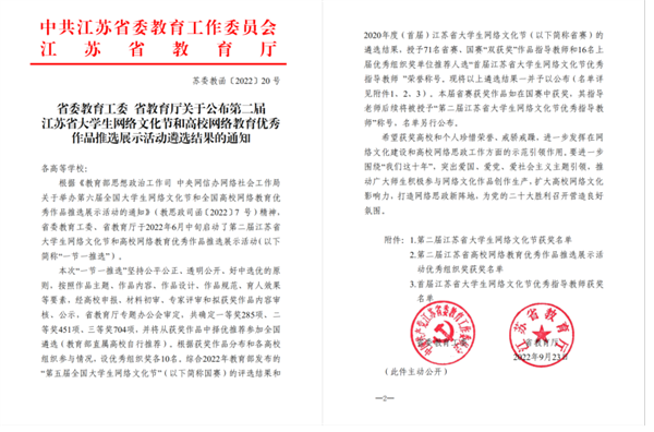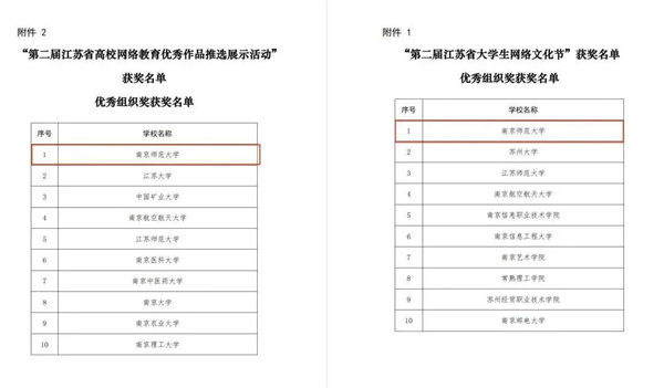 十月,由省委教育工委、省教育厅组织开展的“第二届江苏省大学生网络文化节”(以下简称“一节”)和“第二届江苏省高校网络教育优秀作品推选展示活动”(以下简称“一推选”)遴选结果发布,南京师范大学师生的88件作品从全省各高校的2900余件中脱颖而出,荣获第二届江苏省“一节一推选”活动省级奖项,获奖总数较上一届提升37.5%,其中一等奖数量达43项,获奖总数和一等奖获奖数均位居全省高校第一,学校在“一节”和“一推选”两个活动中均荣获省级“优秀组织奖”(全省仅3所)。