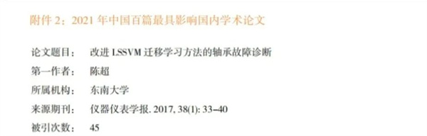 东南大学陈超副教授发表于仪器仪表学报的论文“改进LSSVM迁移学习方法的轴承故障诊断”入选2021年中国百篇最具影响国内学术论文。论文第一作者为东南大学陈超副教授。