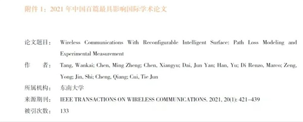 东南大学金石教授课题组与崔铁军院士、程强教授课题组共同发表于IEEE Transactions on Wireless Communications的论文“Wireless communications with reconfigurable intelligent surface: Path loss modeling and experimental measurement”入选2021年中国百篇最具影响国际学术论文。论文第一作者为东南大学青年教师唐万恺副研究员,合作者还包括戴俊彦副研究员、韩瑜副研究员、曾勇教授和巴黎萨克雷大学Marco Di Renzo教授等。